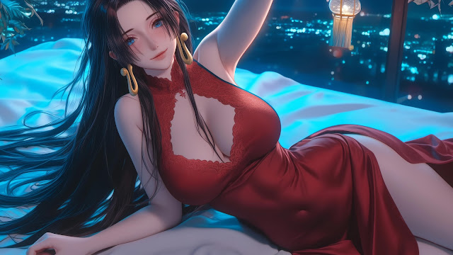 | Nữ hoàng hải tặc Boa Hancock mặc váy đỏ nằm nghiên trên giường |